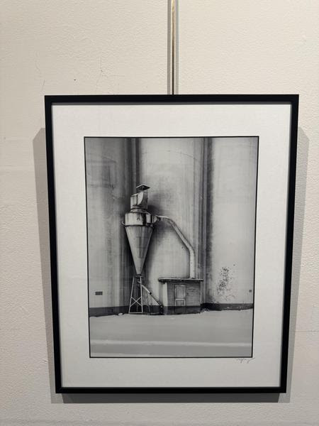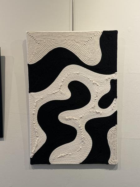 New Life, a mixed-media sculpture in plexiglass (top photo) by Artist Marlene Siff and last year’s 1st prize winner, is a 3D scuplture enclosed in plexiglass. Photographer Matthew Gray’s Grain Silo in Winter looks like a charcoal or pastel drawing. However, the artwork is a photograph. The composition of shapes demonstrates the interplay of shadows on an industrial/agricultural object capturing the beauty. Tatyana Kulartne’s Monocrome II (below) part of a fiber art triptych crafted from natural cotton, “explor[es] rhythm, contrast, and the quiet drama of black and white…invit[es] viewers to experience texture, balance, and visual tension.” Tatyana recently exhibited her neutral fiber art in the Stamford Art Association Member Show. This is where I was first introduced to her artwork. Reviews of Black White and Shades of Gray are now on my Art Critic in 1 Minute Series Channel.